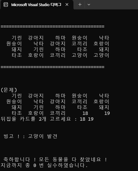 printf("\n\n 빙고 ! : %s 발견\n\n", strAnimal[arrayAnimal[firstSelect_x][firstSelect_y]]);