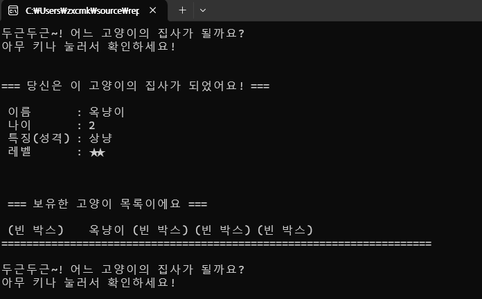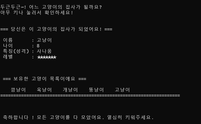 printf("\n\n=== 당신은 이 고양이의 집사가 되었어요! ===\n\n");